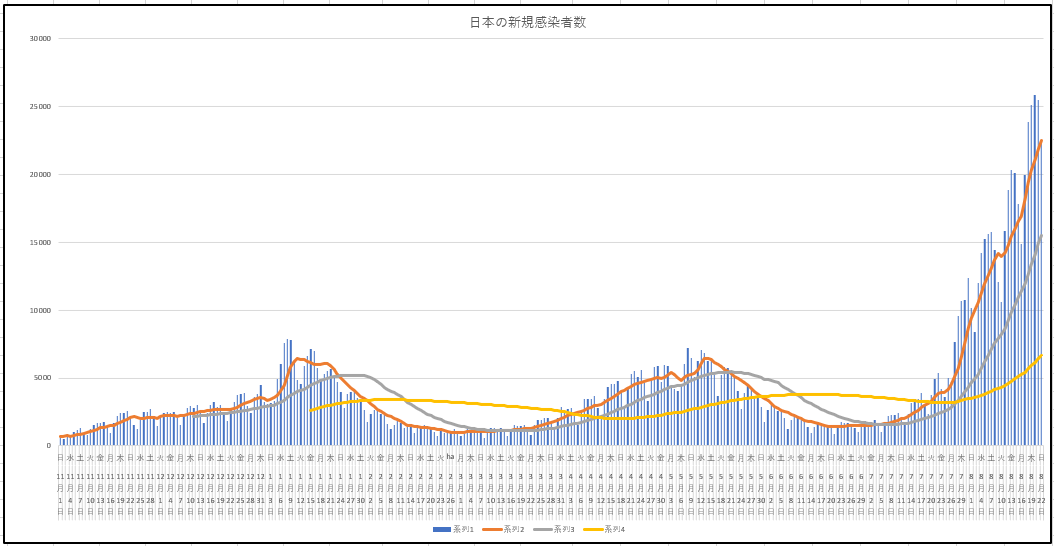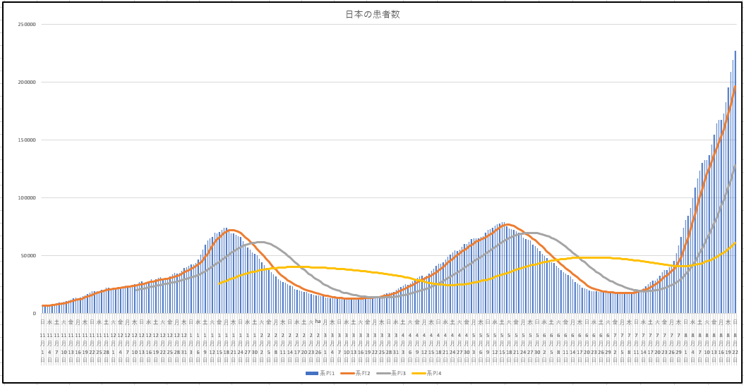 2021/08/23 - りす栗さんの株式ブログ。タイトル:「8月23日(月)相場の前に感染振り返り」 本文:8月22日(日)までの日本の新規感染、現存患者数、重症者数の推移グラフ。左端は2020年11月1日。移動平均線は、7日、28日、84日。それぞれ過去のピークを強く上抜けして上昇中である。患者の重軽の内