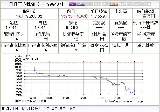 2008/10/09 - nikki3さんの株式ブログ。タイトル:「10月8日のびっくりしたこと」 本文:10月8日は、株価が大暴落しました。 記念にヤフーファイナンスの株価表示を貼っておきます。 日経平均株価は、一日だけで952円下げました。