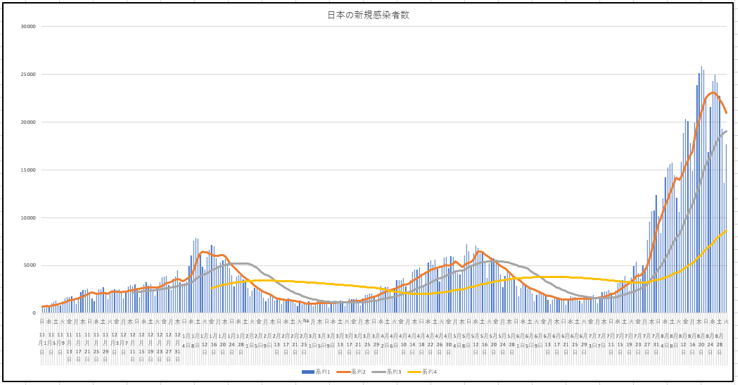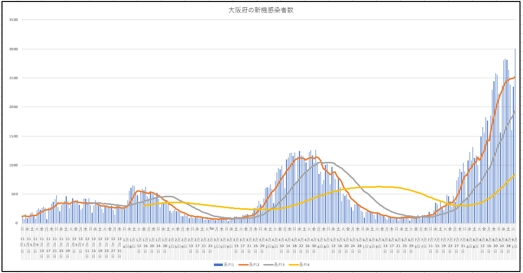 大阪府は下降に転じる前に1日の新規が平均線を