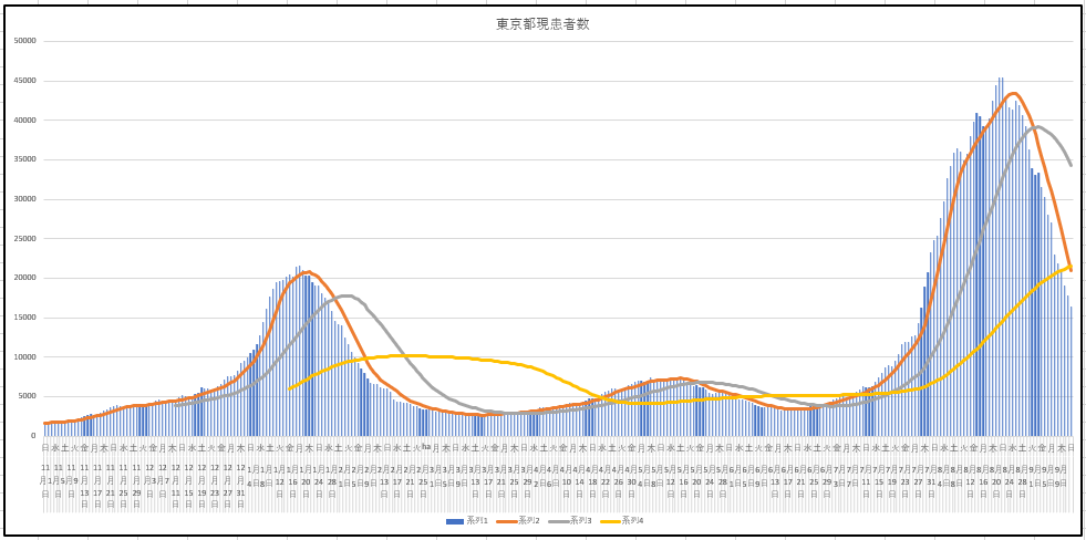 グラフは、新規患者数、現存患者数、入院患者数の推移。