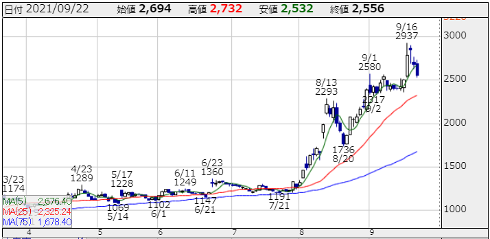 相場が不安定になった事で9月16日2937円の高値から2556円まで値を落としましたが、短期調整を挟んだ形からも拾いやすく、反発からの高値更新が見えますので、期待できると見ていますよ。