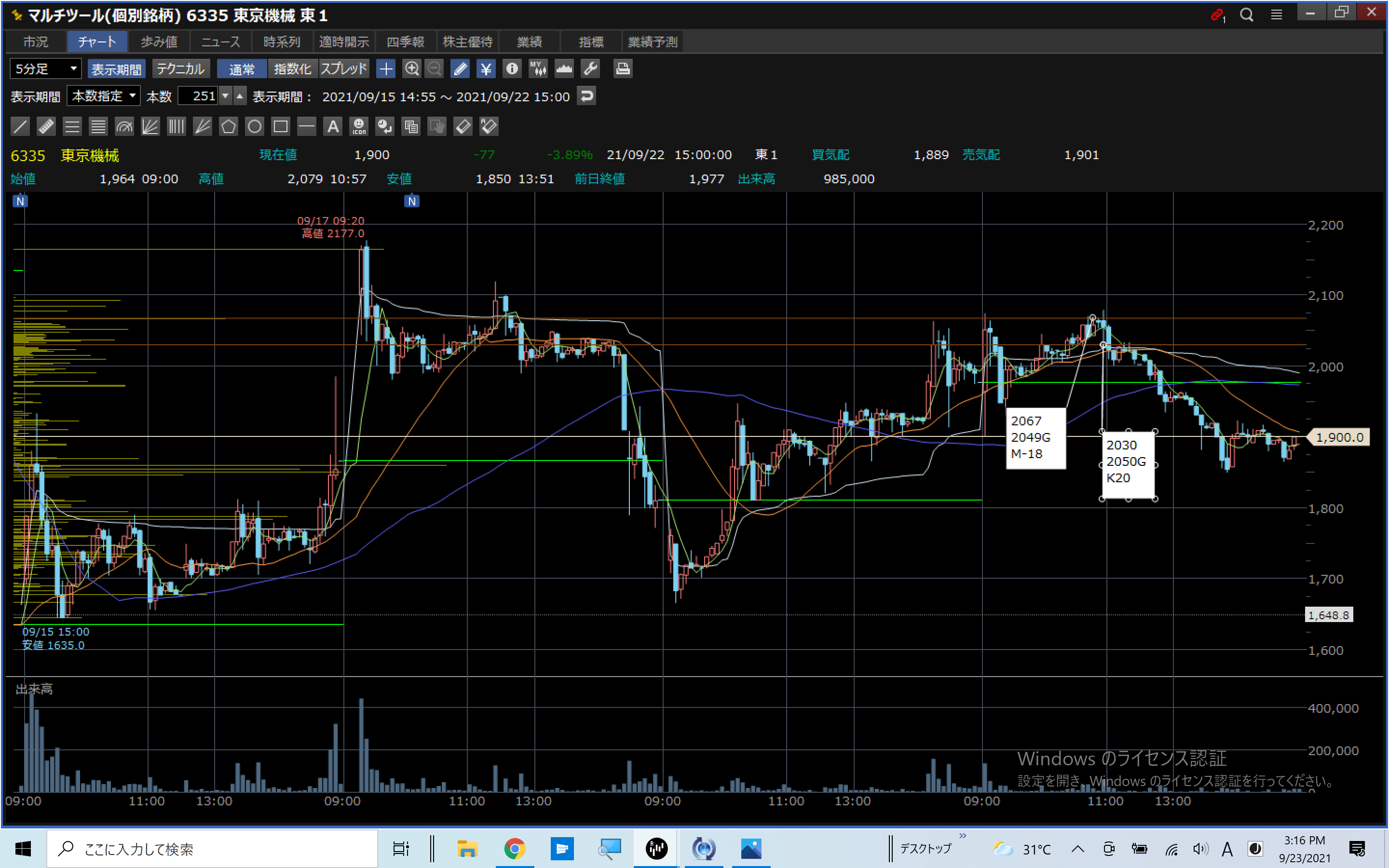 2021/09/23 - 株の素人2021さんの株式ブログ。タイトル:「VT:6335 東京機械 K2 戦略GIF↑」 本文:5分足線の切り替わり、観察が足りない