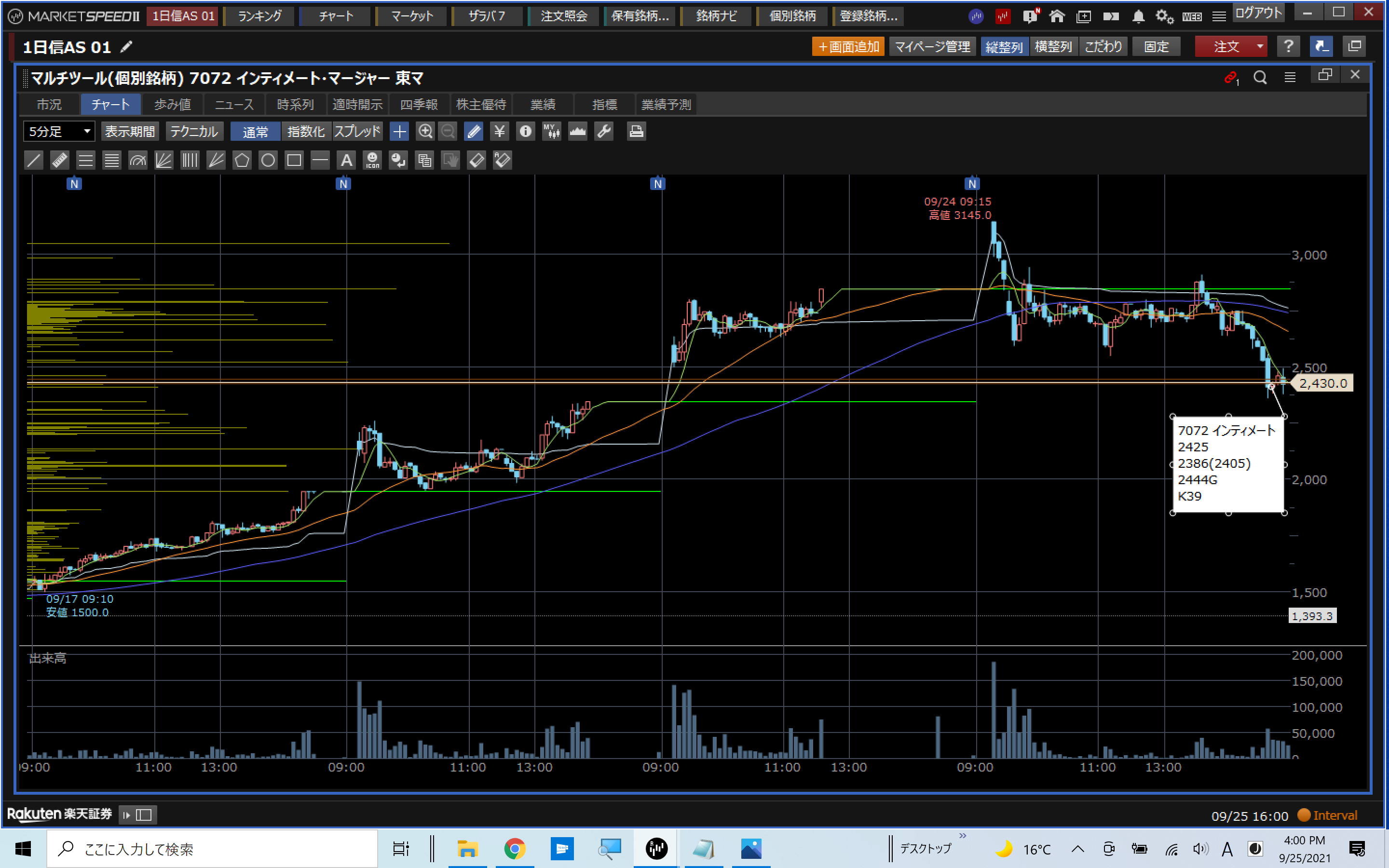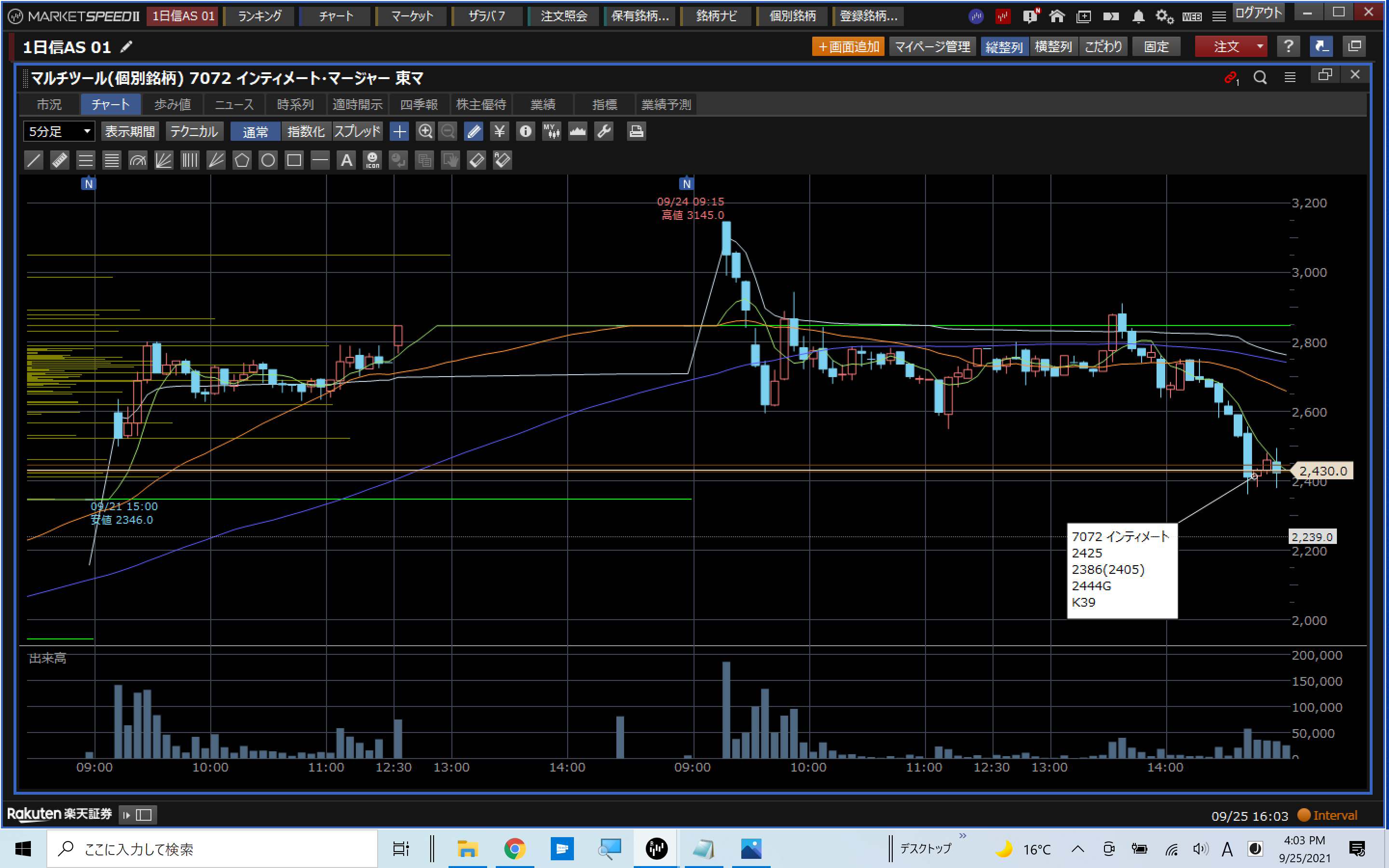 2021/09/25 - 株の素人2021さんの株式ブログ。タイトル:「VT:7072 インティメート K39 前日上昇TOP」 本文:7072 インティメート24252386(2405)2444GK39