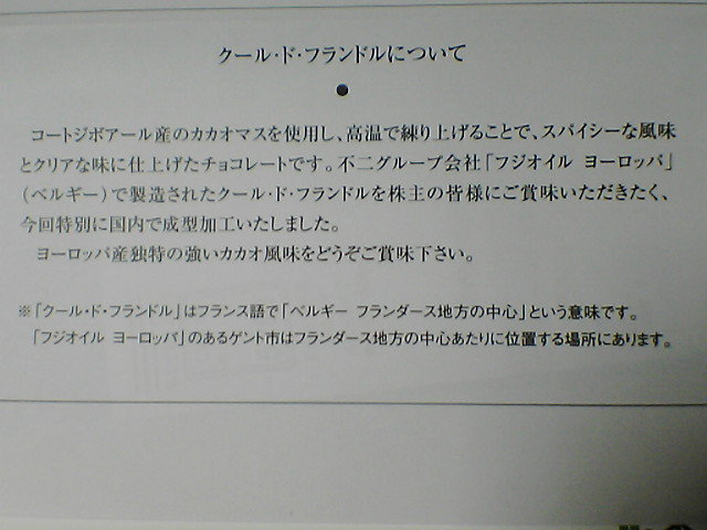 2008/11/04 - nikki3さんの株式ブログ。タイトル:「2008年不二製油 株主優待 特製チョコレートと豆乳セット」 本文:先日2008年の不二製油株主優待が届きました。 2008年から、6月ごろの発送ではなく、11月の発送となりました。 一般では発売していない、特製チョコレートと、 豆乳飲料のセットなので