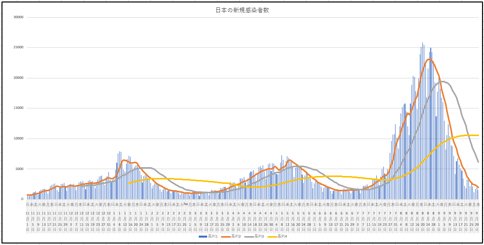 移動平均線は7日、28日、84日で、曜日の差を吸収する