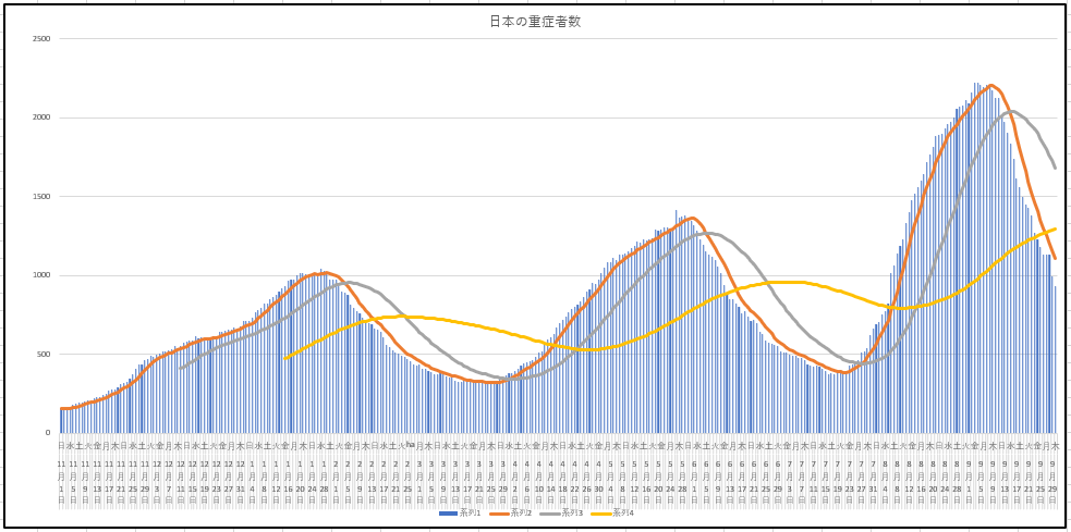 重症者数もそれらに準じてはいるものの、グラフ上では