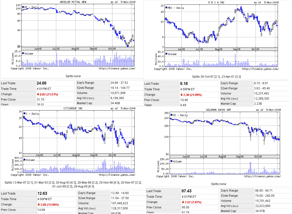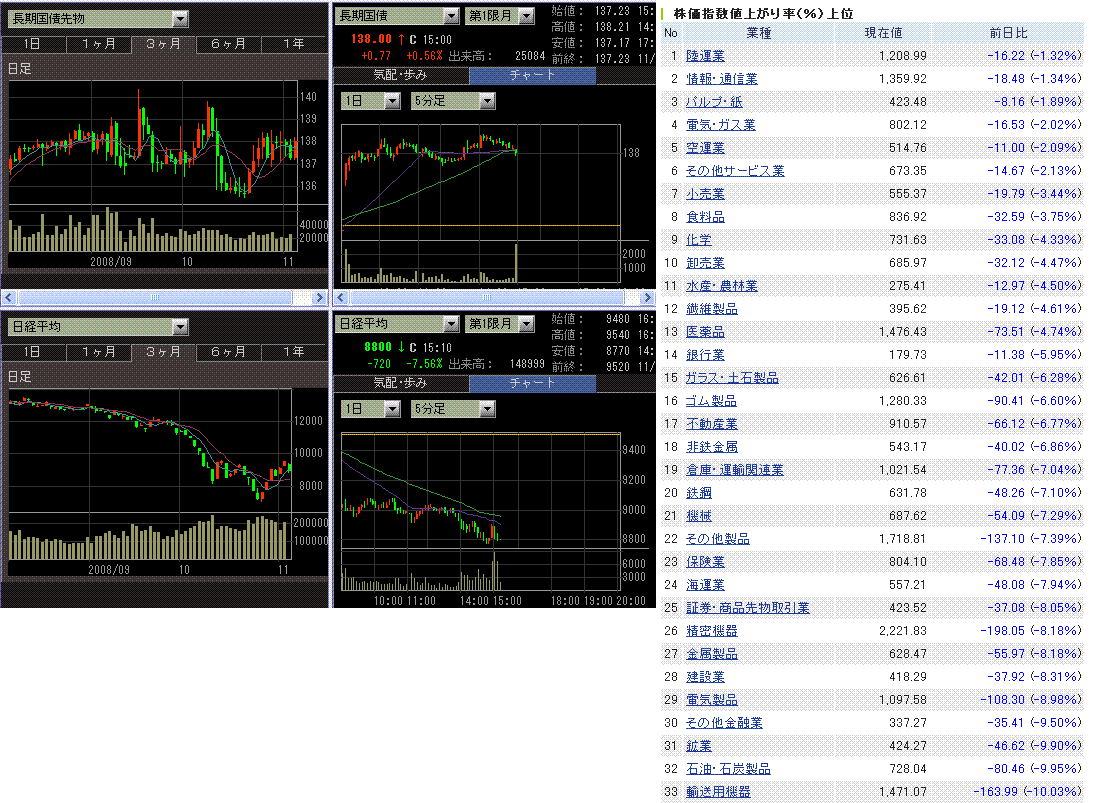 2008/11/06 - NGTNさんの株式ブログ。タイトル:「今日の相場 -11/6-」 本文:∇10/31 ダウ:9,139.2(-486.01) ナスダック総合指数:1,681.64(-98.48) S P500:952.77(-52.98)