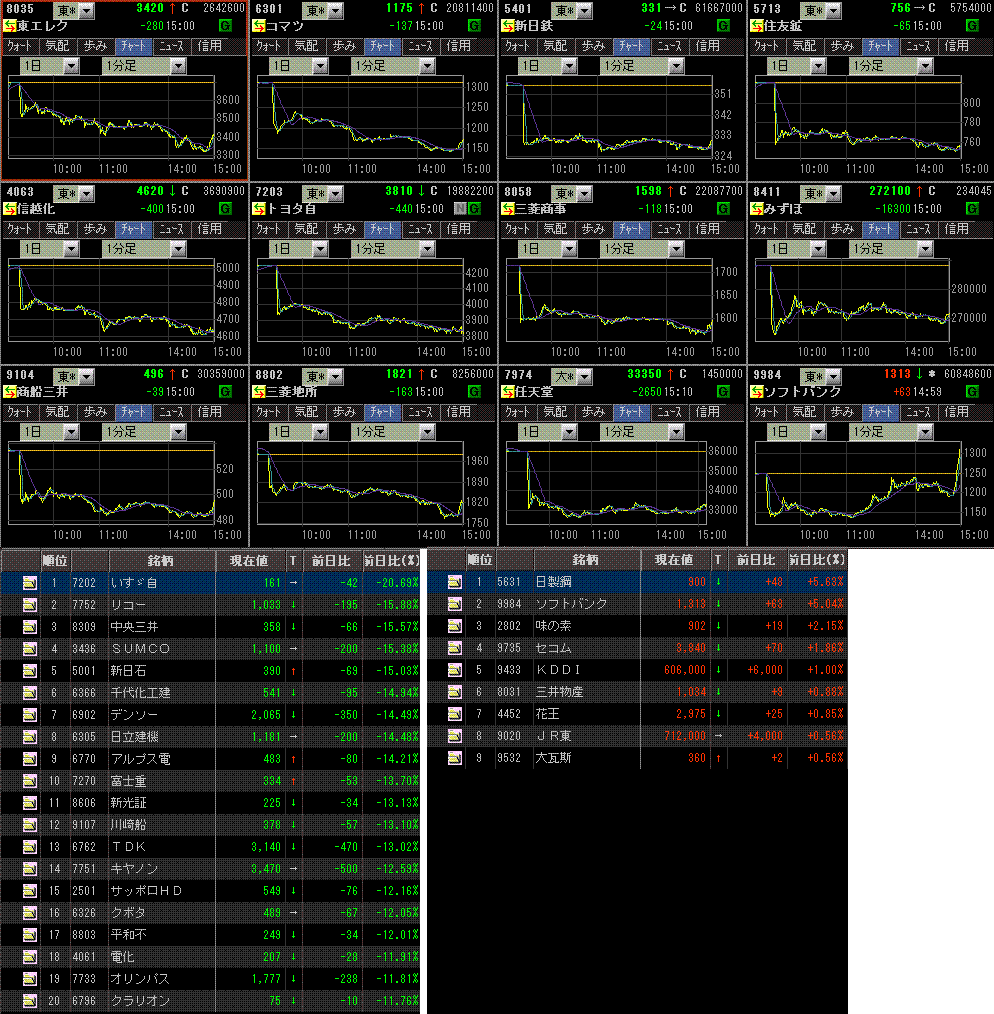 今日は一転して主力大型株が売られました。キヤノンはストップ安。日経225銘柄では、日立建機、SUMCOもストップ安。上げたり下げたり忙しいです。