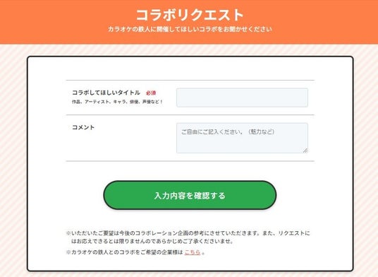 あなたのリクエストが、カラオケの鉄人コラボで実現するかも!?「みんなと共有したい!」作品やコンテンツをコラボリクエストフォームで、ぜひ教えてください。