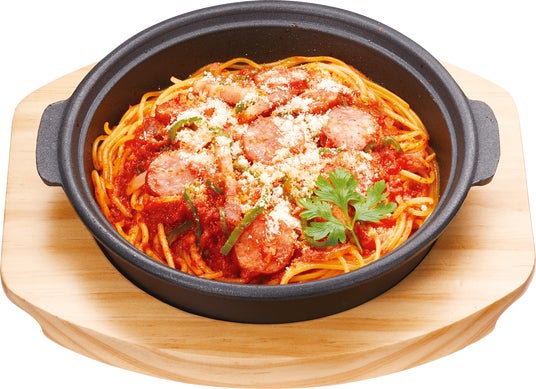濃厚で程よい酸味のトマトソースを使った、熱々のナポリタンです。ソーセージやベーコン、ピーマン、玉ねぎを合わせ、具材たっぷりの一品に仕上げました。別添えのはちみつを加えると、コクと甘みがプラスされ、優しい味わいに。器ごと加熱することでできた、香ばしいおこげもお楽しみください。