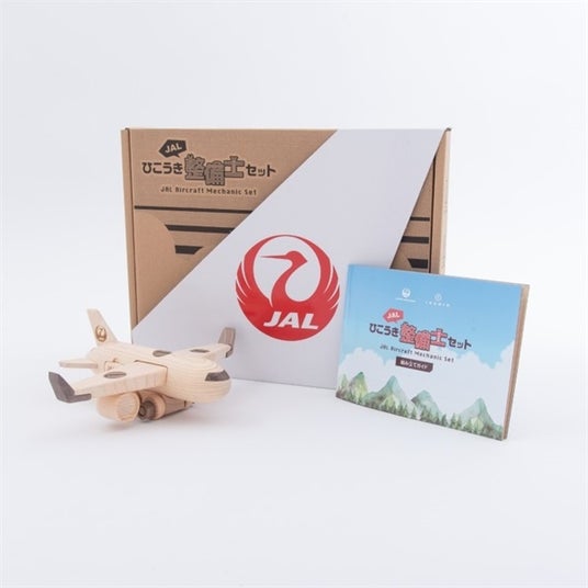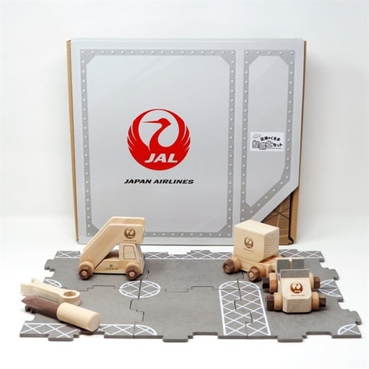 JALオリジナルの木製おもちゃとして、飛行機や整備車両などを組み立てて遊べる“整備士セット”を用意します。2つのおもちゃを組み合わせて、駐機場の様子を再現することができます。