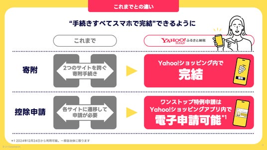 “手続きすべてスマホで完結”をコンセプトに、これまでお礼品選択後の決済や税金の控除手続きについては、各ふるさと納税事業者のポータルサイトに遷移し、各々のサイトで手続きしなければならなかったことも「Yahoo!ショッピング」内にて対応が可能になりました。特に、確定申告不要で寄附金控除が受けられるワンストップ特例制度の電子申請については、「Yahoo!ショッピング」アプリとマイナンバーカードがあればオンラインで控除申請が完結する機能を12月24日(火)より一部自治体で導入予定です。