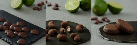 チョコレートは、ワインや日本酒と同じく「発酵食品」です。カカオは収穫後、白い果肉と共に数日間発酵させることで、後の工程で焙煎した際に香り高いチョコレートのアロマが生まれます。新商品3種に使用したライム発酵カカオは、発酵の工程でライムを入れることで、チョコレート製造の工程で果汁や香料を足さずとも、カカオ自体の自然な柑橘の酸味とさわやかな風味が感じられるチョコレートです。今回はライム発酵由来の味わいを生かすため、カカオの焙煎方法や配合にこだわり、ライム発酵のカカオを生かした「チョコレート」「チョコがけカシューナッツ」「チョコサンドクッキー」の3種を新たに開発しました。