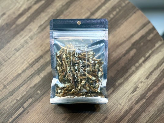 伊吹島甘辛ごまいりこ 400円 頭から尻尾まで余すことなく食べられる伊吹いりこを、砂糖結合水飴と胡麻で和えた商品です。小魚は伊吹いりこのみ使用しています。