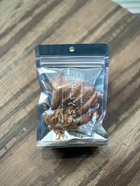 干しべいか 400円香川県内でも安定供給が難しい希少な珍味であるべいかを海水で煮沸し、すぐに機械乾燥させた商品です。※べいかとは、瀬戸内海地方で獲れる小型のイカです。