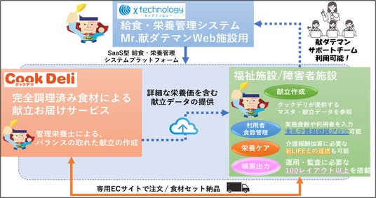 カイテクノロジーのクラウド型栄養・給食管理システム「Mr.献ダテマンWeb施設用」とクックデリの完全調理済み冷凍食品による献立お届けサービス「クックデリ」を組み合わせたトータルサービスが実現します。