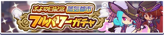内容:「とくもりとっくん」の解放された「フルパワーキャラクター」の「蒸気都市のラフィソル」や、「フルパワーキャラクター」の「蒸気都市のあやしいクルーク」が登場する「ぷよの日記念蒸気都市フルパワーガチャ」を開催します。