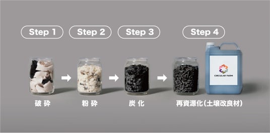 クレサヴァ株式会社が開発した“CIRCULAR FARM(サーキュラーファーム)”のテクノロジーで回収した衣類を炭化、そして土壌改良材へ。土壌改良材は、土中の通気性や保水性を向上させ、微生物による有機物分解を促進する効能があり、野菜や植物を育む健康な土づくりに活用されます。