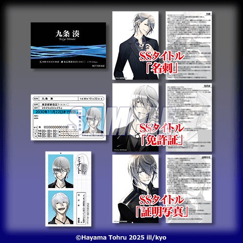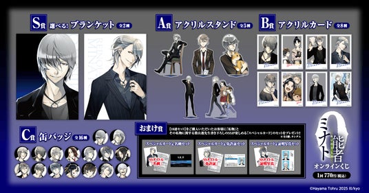 賞品は、イラストレーター・kyo先生の貴重なイラストを使用したオリジ ナルグッズとなります。小説のカバービジュアルなどを使用したブランケットやアクリルカードなど、ファン必携のアイテムをご用意しました。期間中に【10 連セット】を購入すると、九条湊の「私物アイテム」とそのアイテムに関する葉山透先生書き下ろしのSSが楽しめる『スペシャルカード』がセットでもらえる、おまけキャンペーンも開催 します。(全3種、ランダムでの配布となります)また、期間中に“リポストキャンペーン”として、くじ引き堂のX公式アカウントをフォロー&リポストすると、抽選で3名様に「C賞 缶バッジ全16種セット」をプレゼント。この機会をお見逃しなく!!