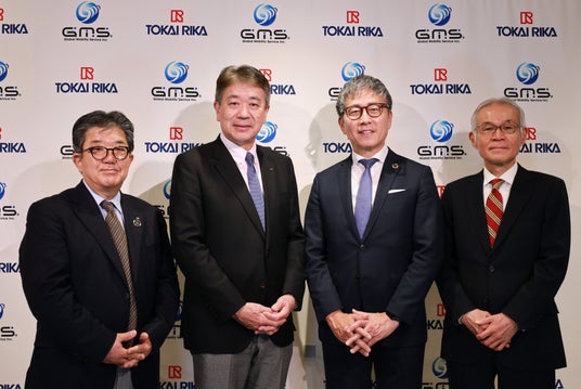 (写真左から)佐藤雅彦 副社長(東海理化)、二之夕裕美 社長(東海理化)、中島徳至 社長(GMS)、米花哲也 会長(GMS)