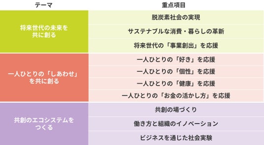 丸井グループは「すべての人が『しあわせ』を感じられるインクルーシブな社会を共に創る」ことをミッションとしています。将来世代を含むステークホルダーとの「共創経営」を実践することで、すべての人の「利益」と「しあわせ」の調和を実現し、ビジネスを通じて社会課題の解決と利益の両立をめざしています。また、実現したい社会のかたちを明文化し、具体的なインパクト目標として掲げています。その3つのインパクト目標の一つに「将来世代の未来を共に創る」を掲げ、重点項目の一つとして「サステナブルな消費・暮らしの革新」を設定しております。