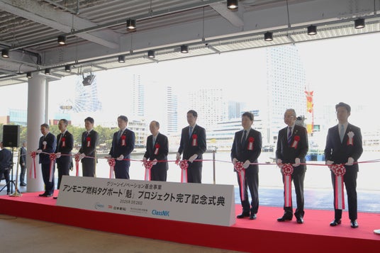また日本郵船は本日、NEDO、IHI原動機、日本海事協会と共に本船の3ヵ月の実証航海が無事に完了したことを記念し、GI基金事業の節目として横浜港で記念式典を開催しました。式典には国土交通省、経済産業省、横浜市等からの代表者が参加しました。