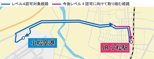 石川県小松市(市長:宮橋 勝栄)、BOLDLY株式会社(ボードリー、本社:東京都港区、代表取締役社長 兼 CEO:佐治 友基、以下「BOLDLY」)、株式会社ティアフォー(本社:東京都品川区、代表取締役CEO:加藤 真平、以下「ティアフォー」)、アイサンテクノロジー株式会社(本社:愛知県名古屋市、代表取締役社長:加藤 淳、以下「アイサンテクノロジー」)および損害保険ジャパン株式会社(本社:東京都新宿区、代表取締役社長:石川 耕治、以下「損保ジャパン」)は、自動運転バスのレベル4走行に向けた取組を行っており、使用している自動運転バス「Minibus」について、3月28日に、小松駅・小松空港間の一般道において、運転者を必要としない自動運転車「レベル4」としての認可を北陸信越運輸局から取得しました。今回の認可の対象は、小松駅から小松空港へ向かうルート全体及び小松空港から小松駅へ向かうルートの一部区間となります。