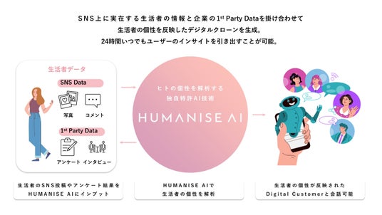 AIQの独自特許技術「HUMANISE AI」はSNS上のデータから個人の特性や興味、ライフスタイルなどの個性ををプロファイリングデータとして抽出し、そのデータをもとに個性を反映したデジタルクローンを生成します。 この技術により、消費者一人ひとりの興味関心を正確に分析し、限られたデータ量でも高精度なデジタルクローンを生成することが可能です。今回活用した「デジタルカスタマー」は、SNS上に実在する消費者の情報と企業が持つ1st Party DataからHUMANISE AIを用いて人のインサイトを可視化し消費者ごとの個性を持ったAIを生成する、次世代のオンライン消費者調査ツールです。デジタルカスタマーを活用することで、24時間いつでも、何度でも気軽に消費者のインサイトを引き出すことが可能となります。