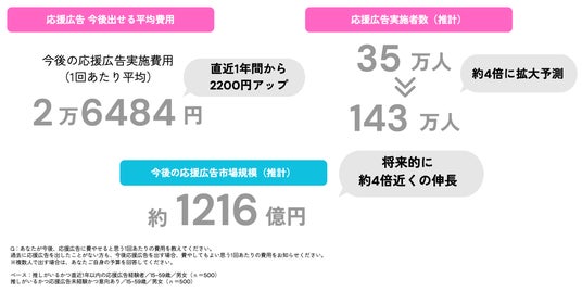 今後、応援広告に費やせると思う1回あたりの費用を聞いたところ、平均約2万6000円となり、直近1年の実施費用から平均で2200円アップする結果となりました。また、応援広告の実施者は、現在35万人と予測されますが今後は143万人までに拡大すると予測されます。現在の実施者から約4倍の規模に拡大するとともに、市場規模も約1216億円と将来的に現在の4倍近くまで伸長するポテンシャルを秘めています。個人発の広告が、今後より大きな市場に成長する可能性を感じられる結果となりました。