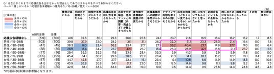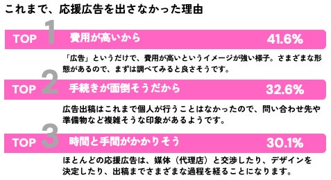 応援広告を出さなかった理由、1位は「費用が高いから(41.6%)」。費用、面倒さ、時間の確保が障壁になっている