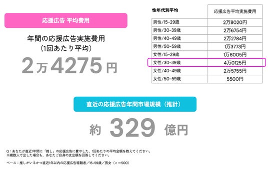 直近1年間に費やした応援広告、1回あたりの平均費用は約2万4000円。直近の市場規模は約329億円の推計