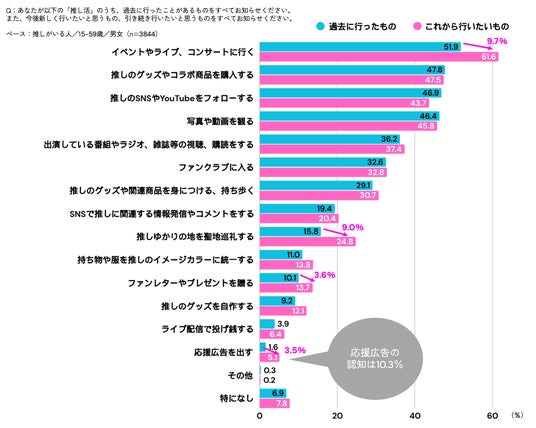 過去に行った/これから行いたい推し活、ともに「イベントやライブ、コンサートにいく」が最多。「応援広告を出す」は現在少数派(1.6%)だが、今後の実施意向は5.1%にアップ