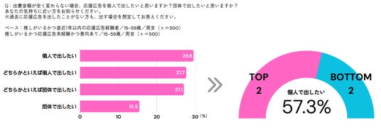 応援広告の出稿方法は「他のファンと共同で出した」が83%。一方で、「個人で出したい」人は57.3%と「団体で出したい(42.7%)」を上回る結果