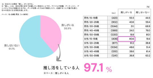 国内の15~59歳の男女約1万人に調査をした結果、「推しがいる」と回答したのは38.9%となりました。性年代別に見ると、男女いずれも15~19歳が他の年代より「推しがいる」割合が高く、特に15~19歳女性では80.6%に「推しがいる」という結果になりました。また、推しがいる人のうち97.1%がなんらかの推し活を行っており、推し活が日常的な文化として年代問わず広がっている様子が伺えます。