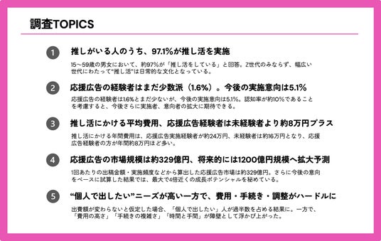 今回の調査から、応援広告はファンによる新たな表現手段として広がりを見せ、今後大きく成長が期待される市場であることが明らかになりました。“個人による広告”の広がりは、企業や広告・マーケティング業界にも新たな影響を与える可能性があり、注目すべき次世代の文化としてその存在感を強めていくと予測されます。