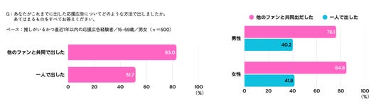 これまでに出した応援広告について、どのような方法で出したのかを聞いたところ「他のファンと共同で出した」と回答した人は83%となりました。男女別で見ると、共同で出した率は女性の方が84.6%と男性(76.1%)に比べ8.5ポイント高い結果となりました。応援広告について、女性の方が悩んでいる率が相対的に低く見受けられるのは、団体で出す比率が高く相談できる環境があるためという仮説も考えられます。