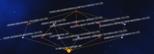 KIBIT Seizu Analysisのシステム画面イメージ。自社(黄色)のサプライチェーンネットワーク上流に制裁リスト掲載企業等(赤)が含まれているかどうかが一目で把握できる(※イメージ画像のためぼかし加工をしています。実際のシステム画面上では鮮明に表示されます)