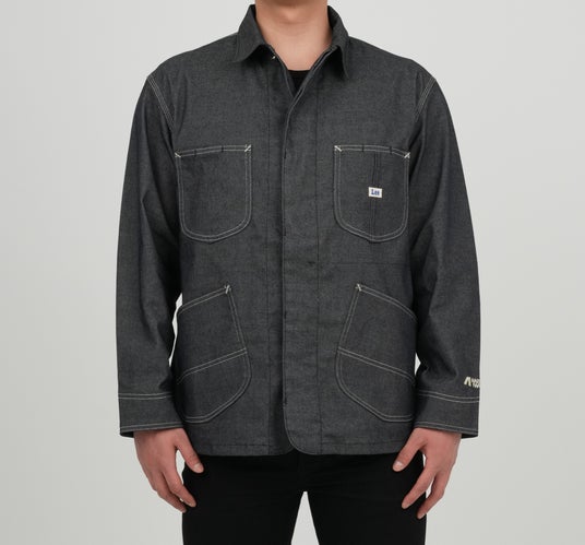 Leeを代表するダンガリーズシリーズのロコジャケットをベースにアレンジしました。自動車整備・板金塗装時における着用でも車のボディに傷がつかないよう、すべてのボタンと金具を隠す仕様になっています。