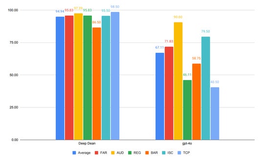 なお検証にあたってはGPT-4oについても同様のテストを実施しました(それぞれ数回の実施をした上で平均値を出しています)。グラフは左からDeep Dean、GPT-4oの順で各モデルの結果を示しており、それぞれ平均スコア、必須科目であるFAR(財務会計)、AUD(監査及び証明業務)、REG(税法及び商法)、そして選択科目のBAR(ビジネス分析及び報告)、ISC(情報システム及び統制)、TCP(税法遵守及び税務計画)の各スコアとなっています。
