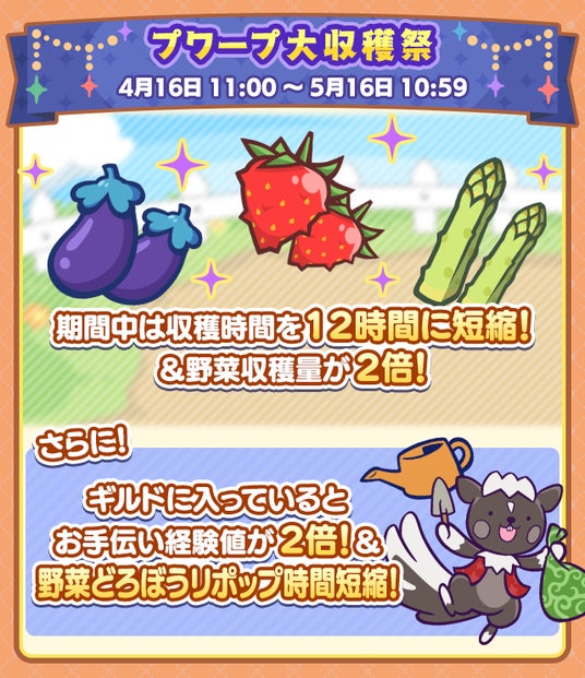 内容:「ぷよ野菜」の収穫時間が22時間から12時間に短縮され、「ぷよ野菜」が2倍収穫できる「プワープ大収穫祭」を開催します。