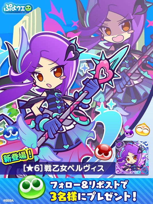 内容:『ぷよぷよ!!クエスト(ぷよクエ)』公式X(旧Twitter)アカウントと公式Instagramアカウントにて、キャンペーンに参加した方の中から抽選で、「[★7]戦乙女アミティ」「[★6]戦乙女ペルヴィス」をプレゼントするキャンペーンを開催します。