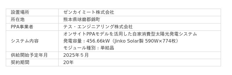 テスホールディングス株式会社(本社:大阪市淀川区、代表取締役社長:山本 一樹、以下「当社」)は、連結子会社であるテス・エンジニアリング株式会社(本社:大阪市淀川区、代表取締役社長:高崎 敏宏、以下「テス・エンジニアリング」)が、ハラール認証を含む高品質な牛肉の生産・加工・販売を行うゼンカイミート株式会社(本社:熊本県球磨郡錦町、代表取締役社長:南村 輝夫、以下「ゼンカイミート」)向けに、オンサイトPPAモデル※1を活用した自家消費型太陽光発電システムによる再生可能エネルギー電気の供給(以下「本事業」)を行うことが決定いたしましたので、お知らせいたします。本事業による再生可能エネルギー電気の供給は、2025年5月から開始予定です。