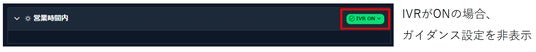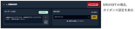 営業時間内は、IVRかガイダンス設定(受付ON/OFF)のいずれかを設定いただくことが多いため着信設定画面内にIVRのON/OFFを移動し、すぐに設定ができるよう変更いたしました。それに伴い、IVRがOFFの場合にのみ、ガイダンスの設定を表示いたします。