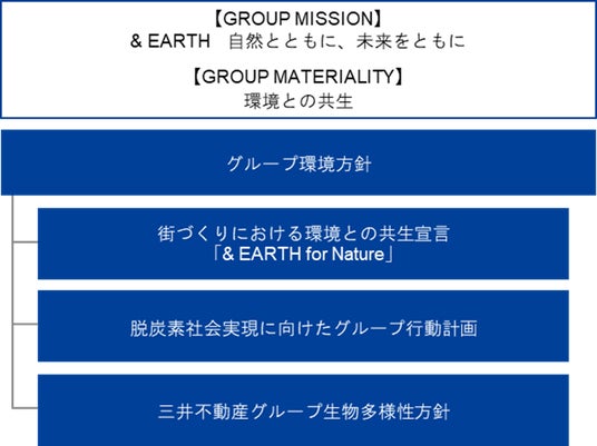 当社グループは、企業活動全般における環境に関する大方針として「グループ環境方針」を定めています。そして、具体領域に関わる個別方針等として、街づくりにおける環境との共生宣言「& EARTH for Nature」、三井不動産グループ生物多様性方針、脱炭素社会の実現に向けたグループ行動計画を位置づけています。