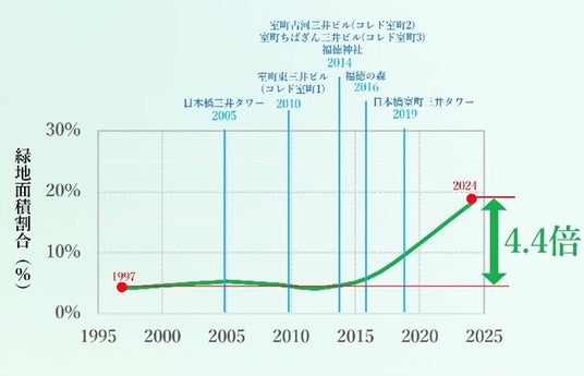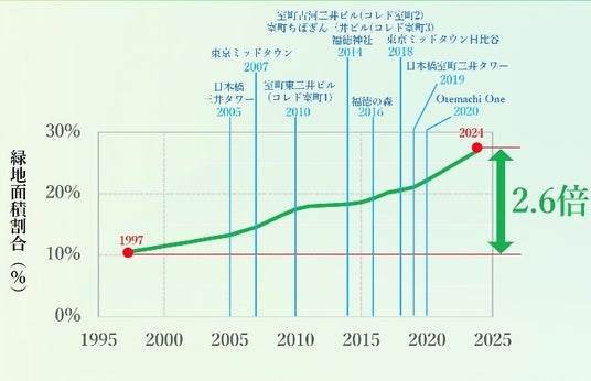 開発前と比較した緑の面積は、代表的大規模開発9物件(※1)では2.6倍、日本橋エリア6物件(※2)では4.4倍に増加したことが分かりました。
