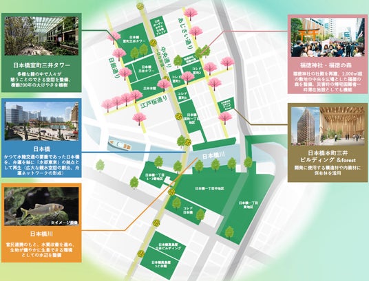 創業の地である日本橋では、「残しながら、蘇らせながら、創っていく」をコンセプトに、1990 年代後半より、官・民・地元一体で「日本橋再生計画」を推進しています。自然も人も地域もより豊かになる街づくりを通じて、豊かな環境づくりを広げていきます。