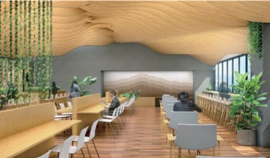 3階ラウンジには、保有林の木材を内装・仕上げ材の一部に使用し、木質感あふれる空間を創出します。利用する木材の木が生育する北海道美瑛町エリアの森林で音源を採取し、「KooNe」※5のハイレゾ空間音響システムを用い、森林内の音空間を再現します。物流用途施設に求められる耐火性能を確保しながら、1階~4階まで木質あふれる空間とすることで、ワーカーや訪れる方に安らぎと癒しを提供します。