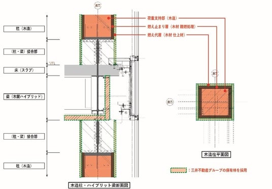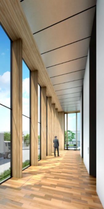 国産材を建物構造に採用する共用部は特徴的な高い階高(6.6m)と、広い空間(10.8m×13m)であり、木造柱+木鋼ハイブリッド梁(二時間耐火)で建設いたします。木鋼ハイブリッド梁は国土交通大臣認定を受けた耐火構造部材(2時間耐火)※4を採用しています。鉄骨梁の周囲に耐火被覆部材として、石こうボードと木材を取り付けた断面構成となっており、木材が炭化を伴いながらゆっくりと燃えることにより熱の侵入を抑制し、耐火性能を確保することができます。構造様式は、木鋼ハイブリッド梁フレームに対して鉛直支持力を木造柱が担う「鉄骨造一部木造」となります。共用部のうち木造とした一部では木造構造や木質デザインを積極的に取り入れることにより、鉄骨造で建築した場合と比較してCO2排出量を約40%低減することを見込んでいます。