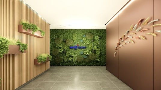 本施設のメインエントランスは、木と植物の風合い、香りを感じられる有機的で柔らかい空間としています。また、壁面にはかつて田圃だった土地の記憶を紡ぎ、「豊作」を象徴する稲穂を表現したアートを設置。欄間職人が伝統技術を活かして造形し、人と自然の調和を表現します。