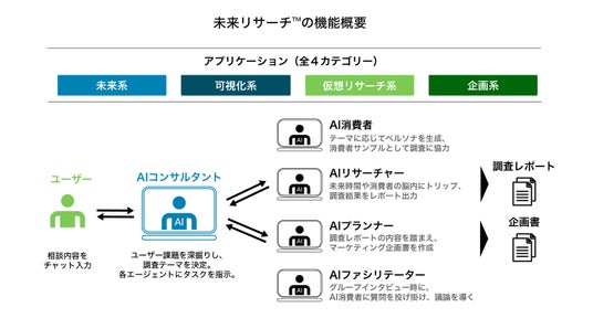 未来リサーチ(TM)は、全4つのカテゴリー、計5つのアプリケーションから提供をスタートする予定でおり、お客様の声に応じて順次追加を行い、最終的には15のアプリケーションの提供を目指して開発を進めています。それぞれのアプリケーションは、コンサルタント、消費者、リサーチャー、プランナー等の機能を持たせたAIエージェントが各々の役割を担うことで、ユーザーへの課題のヒアリングと深掘り、仮想的なリサーチの実施、調査レポートの作成、調査結果を踏まえたマーケティング企画書の作成までを、その場で実行することを基本機能としています。各エージェントが自律的に役割を実行することから、ユーザーは、基本的にAIコンサルタントから投げ掛けられる質問に答えるだけでレポートや企画書の作成までを完結することができます。
